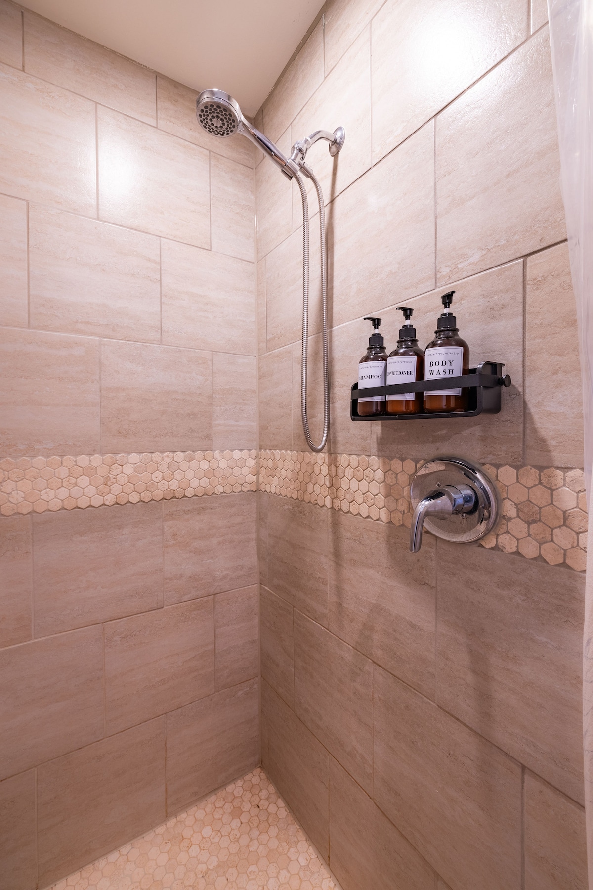 Our half bathroom is fully stocked with everything needed including toilet paper, soap, shampoo, body wash, and conditioner.